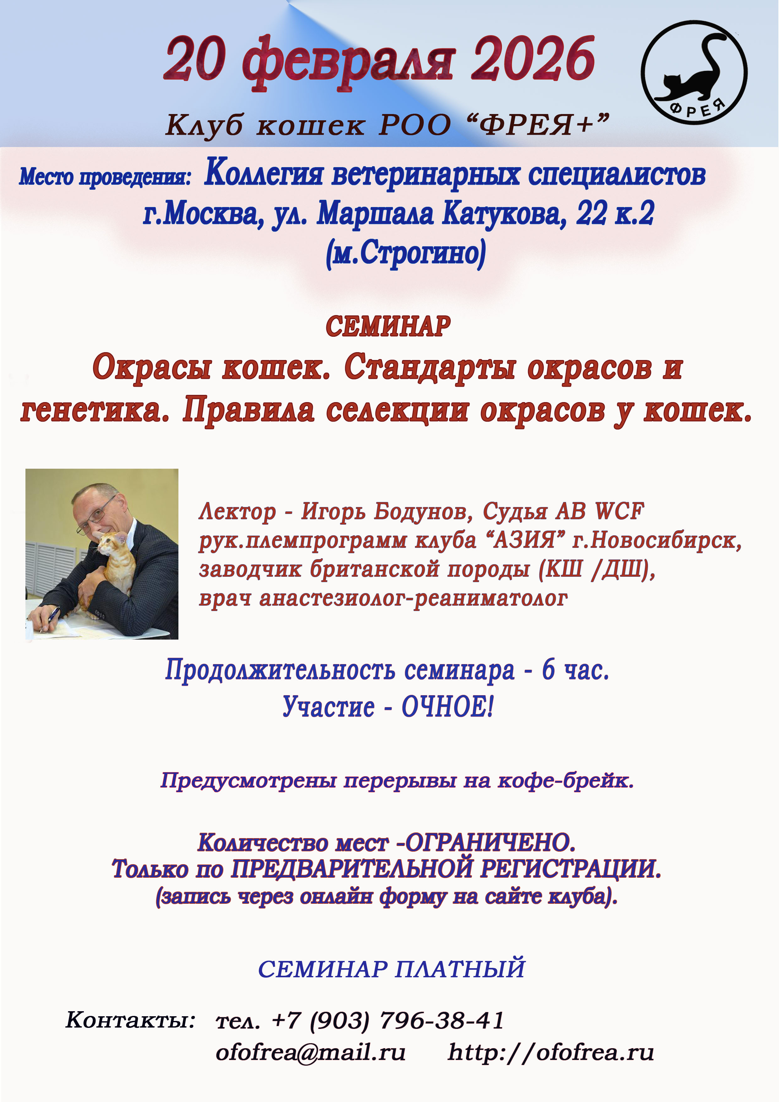 фелинологические курсы, консультации. Сотрудничает со многими кормовыми компаниями,