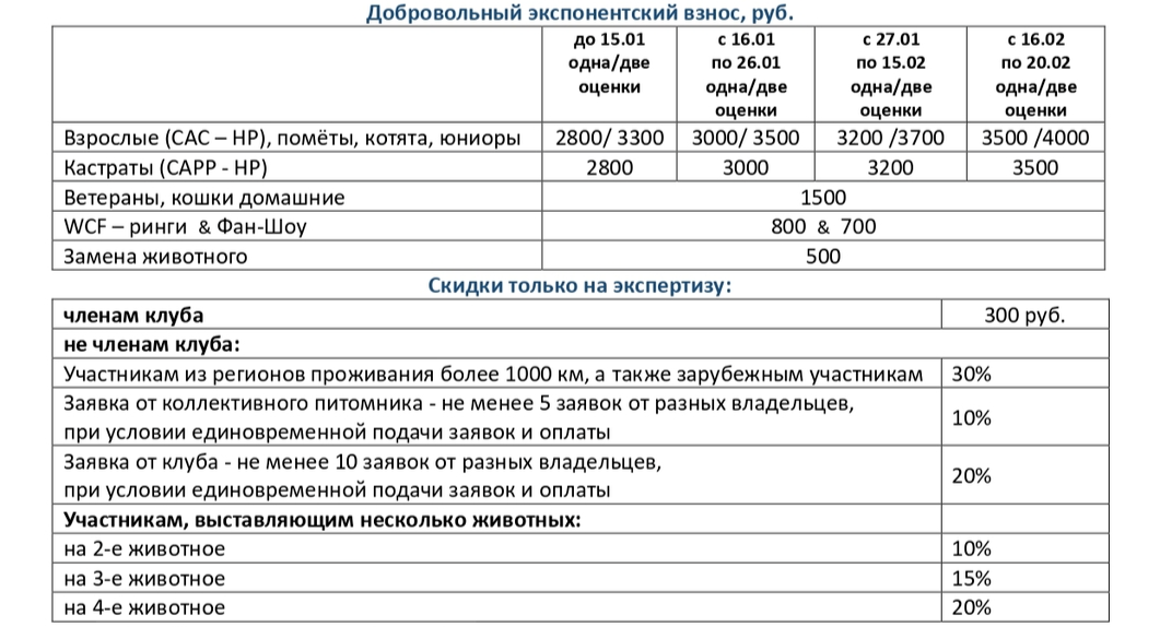 - Скидки не суммируются! Экспонентский взнос, по причине владельца животного, не возвращается.